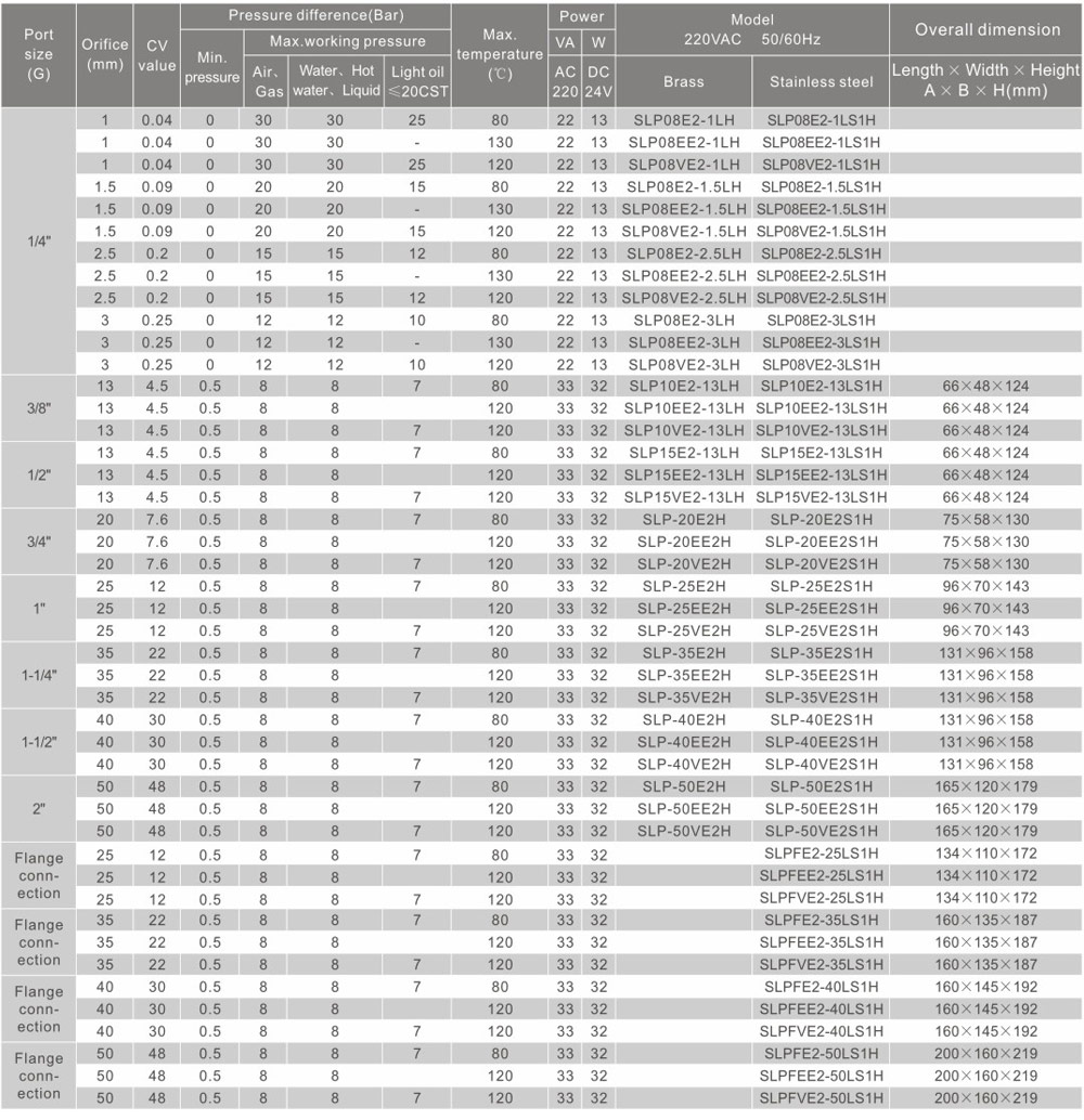| Port Size (G) | Orifice (mm) | CV Value | Pressure difference(Bar) | Max. temperature (℃) | Power | Model 220VAC 5C/60Hz | |||||
